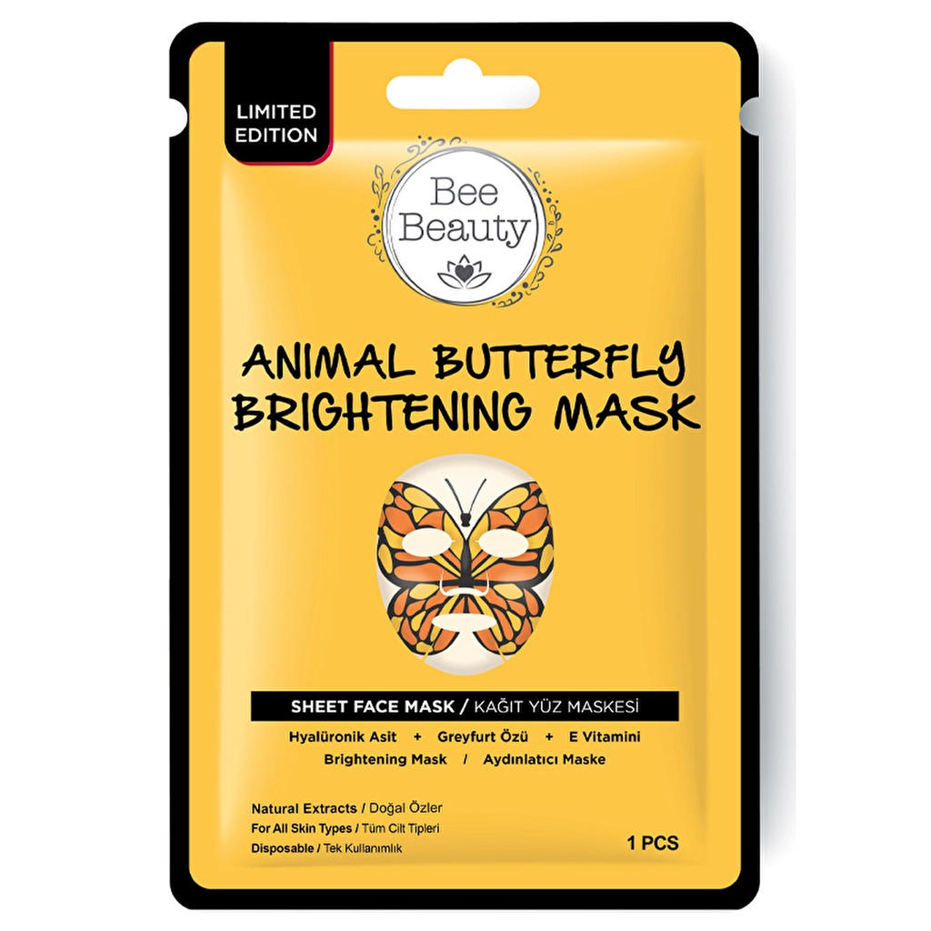 Bee Beauty Butterfly Kağıt Maske 25 gr tüm cilt tiplerinde kullanıma uygundur. Yoğun nemlendirici özelliği sayesinde cilt bakımı rutininin ayrılmaz parçalarından biridir. Özel formülünde hyaluronik asit, E vitamini ve greyfurt özü bulunur. Hyaluronik asit cildin zaman içerisinde çeşitli nedenlere bağlı olarak kaybolan elastikiyetinin geri kazanmasına yardımcı olur. Greyfurt özü ve E vitamini ise ciltte kırışıklık oluşmasını önlemeye, cilt tonunun eşitlenmesine ve daha aydınlık bir cilt tonuna ulaşmaya katkıda bulunur.
